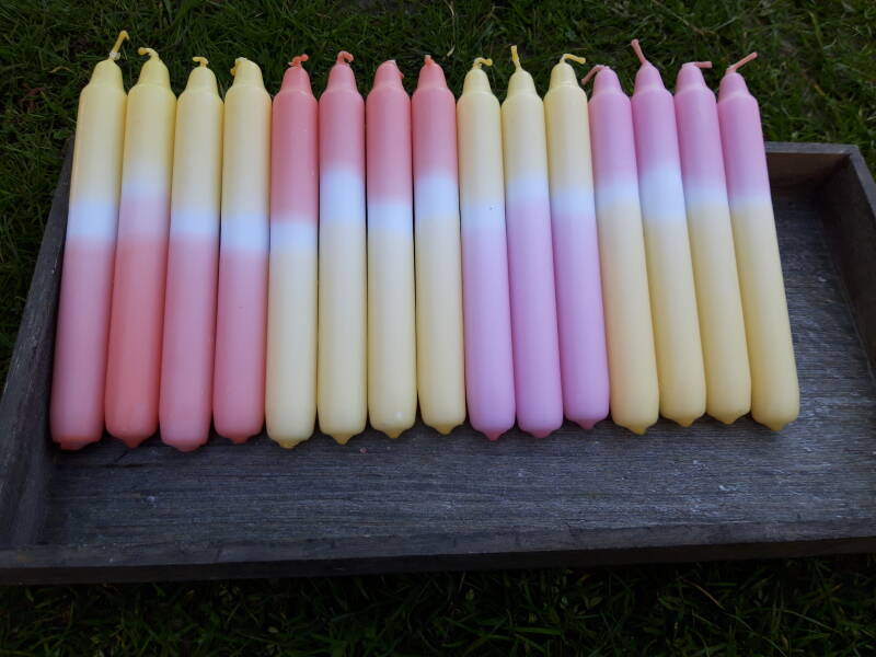 mooie dip dye dinerkaarsen in de kleuren oranje-wit-geel en roze-wit-geel.